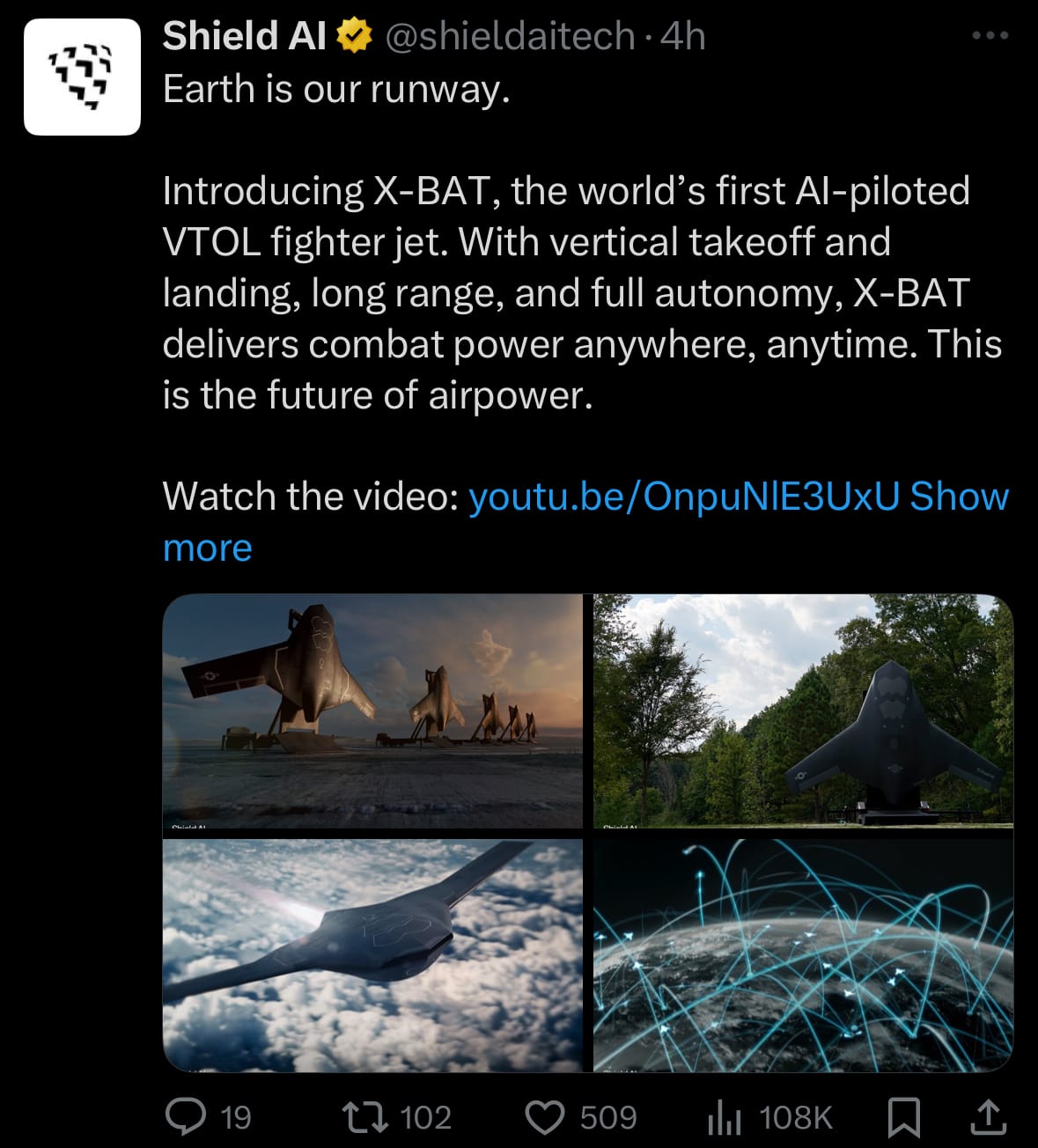 - On October 21, 2025, Shield AI announced the X-BAT, a new autonomous VTOL fighter drone designed as a stealthy loyal wingman for manned aircraft or standalone operations. The drone features a range exceeding 2,000 nautical miles, an internal weapons bay, and external hard points for munitions, enabling it to perform tasks like reconnaissance, strike missions, and electronic warfare without human pilots. Powered by Shield AI's Hivemind AI system for fully autonomous flight, the X-BAT aims for an initial flight test by 2026, with demonstrations showing its agility in vertical takeoff and landing. The unveiling positions it as a cost-effective alternative to traditional fighter jets, focusing on scalability for military applications.