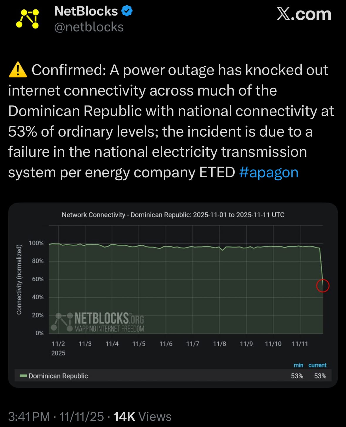 - On November 11, 2025, the Dominican Republic experienced a nationwide power outage that affected the entire country of nearly 11 million residents, starting around 1:23 p.m. local time. The blackout was triggered by a failure in the transmission system at the San Pedro I substation, which caused a cascade effect leading to the shutdown of key generation units at the San Pedro de Macorís and Quisqueya power plants. This incident compounded ongoing issues with the electrical grid, including recent outages lasting up to 10 hours attributed to insufficient maintenance on transmission infrastructure and illegal connections, as noted by Energy Minister Joel Santos.