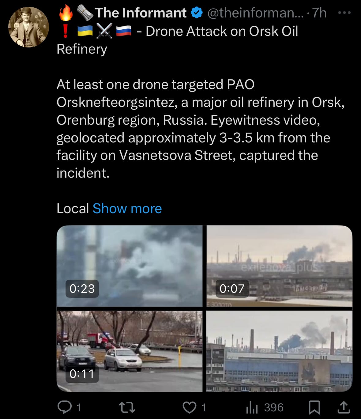 - On November 11, 2025, Ukrainian forces carried out a drone strike on the Orsknefteorgsintez oil refinery in Russia's Orenburg region, located about 1,400 kilometers (870 miles) from the front lines, resulting in explosions and a fire at the facility. The attack, attributed to Ukraine's Security Service drones, targeted key infrastructure at the refinery, which processes around 6 million tons of oil annually and supplies fuel to Russian military operations. Local authorities reported no casualties, though operations were temporarily disrupted, with emergency services responding to contain the blaze. This marks the second reported strike on the Orsk refinery in recent months, following a similar incident earlier in the year that caused flooding-related damage.