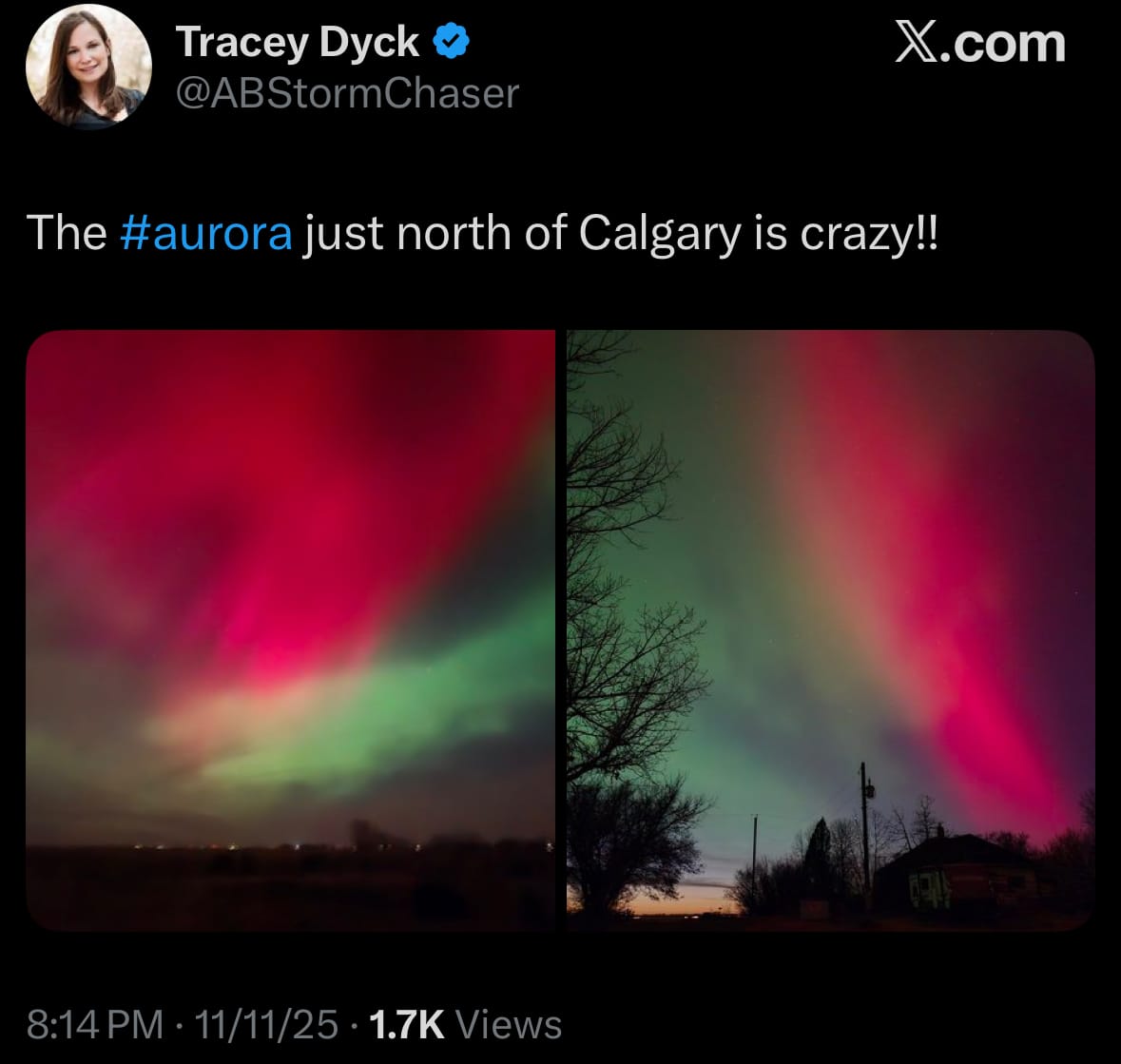 - Aurora borealis appeared across much of North America on the evening of November 11, reaching unusually south to states like Alabama, North Carolina, Missouri, Oklahoma, Texas, Arizona, and California, visible to the naked eye in the north and through long-exposure photos farther south. Bright colors such as greens, purples, reds, and pinks lit up skies in places like Minnesota, Idaho, Maryland, and New England, best seen from 10 p.m. to 2 a.m. local time in dark spots facing north away from lights. At G4 levels, possible effects include small power grid adjustments in high-latitude zones, extra drag on satellites needing position fixes, and brief high-frequency radio outages in polar areas, but no major issues with GPS, aviation, or broad infrastructure have occurred yet.