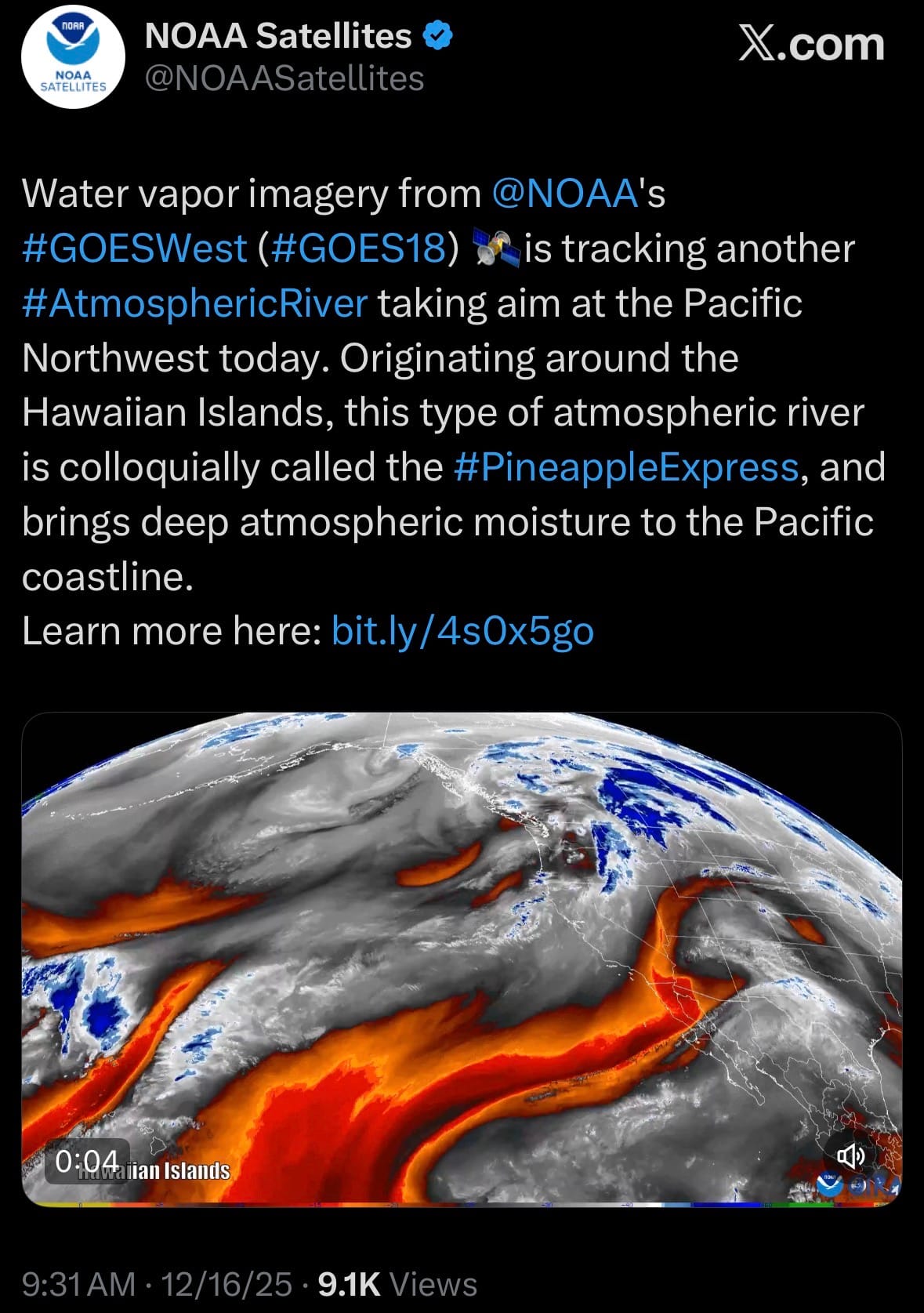 - On December 16, 2025, NOAA's GOES-18 (GOES West) satellite captured water vapor imagery showing a Pineapple Express atmospheric river—a narrow plume of deep tropical moisture originating near the Hawaiian Islands—moving toward the Pacific Northwest. This system is delivering heavy rainfall to western Washington, Oregon, and northwestern California, exacerbating ongoing recovery from historic flooding caused by prior atmospheric rivers earlier in December. Impacts include renewed river rises, levee breaches (such as along the White and Green Rivers in Washington), evacuations, mudslides, urban flooding, and strong winds gusting up to 60-90 mph in some areas.