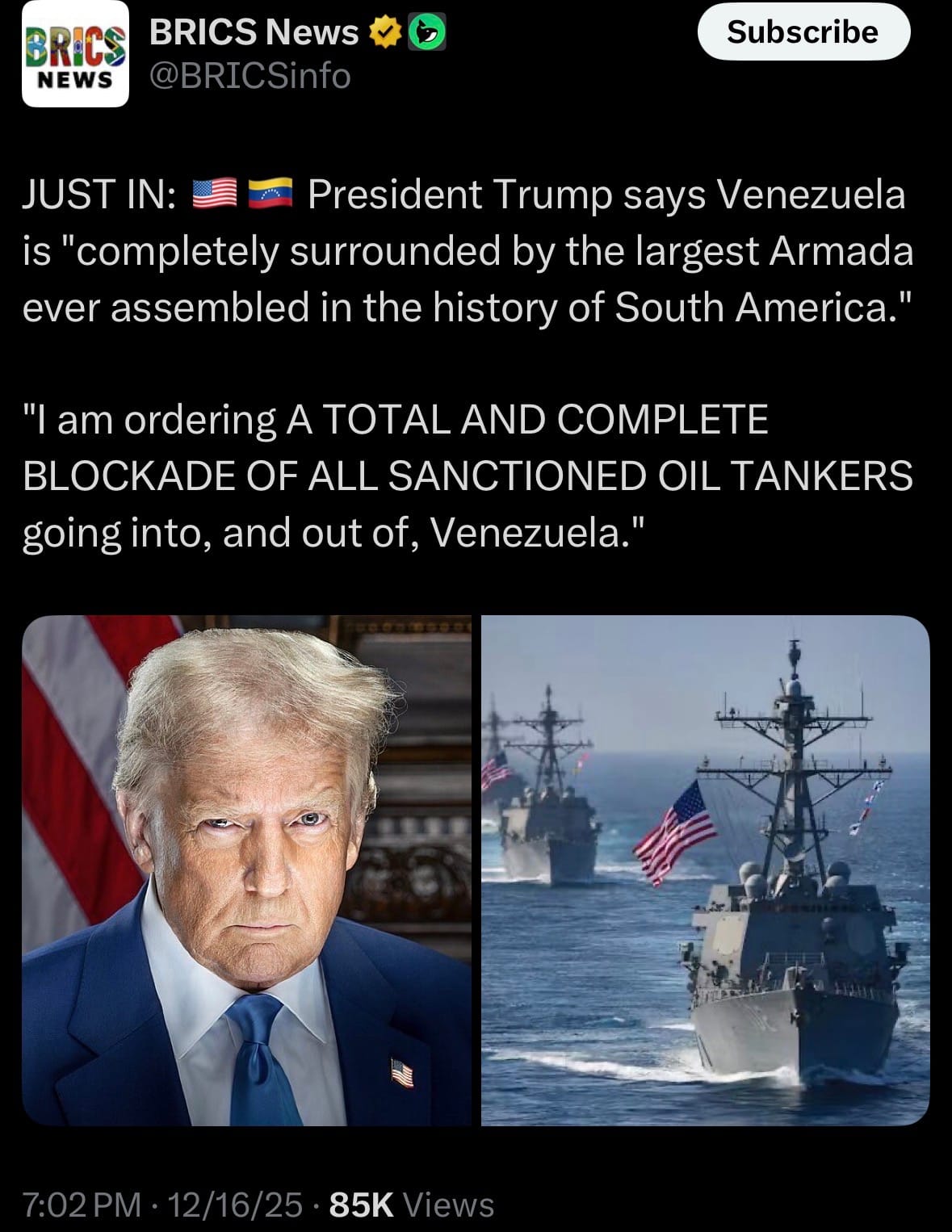- On December 16, 2025, U.S. President Donald Trump announced on Truth Social a "total and complete blockade" of all U.S.-sanctioned oil tankers entering or leaving Venezuela. He claimed the country is "completely surrounded by the largest Armada ever assembled in the History of South America" and designated the Venezuelan government under President Nicolás Maduro a Foreign Terrorist Organization, citing allegations of theft of U.S. assets, drug smuggling, human trafficking, and terrorism. The blockade targets vessels involved in Venezuela's oil trade, following a recent U.S. seizure of a sanctioned tanker and ongoing military operations that have included lethal strikes on over 25 vessels, resulting in at least 95 deaths.