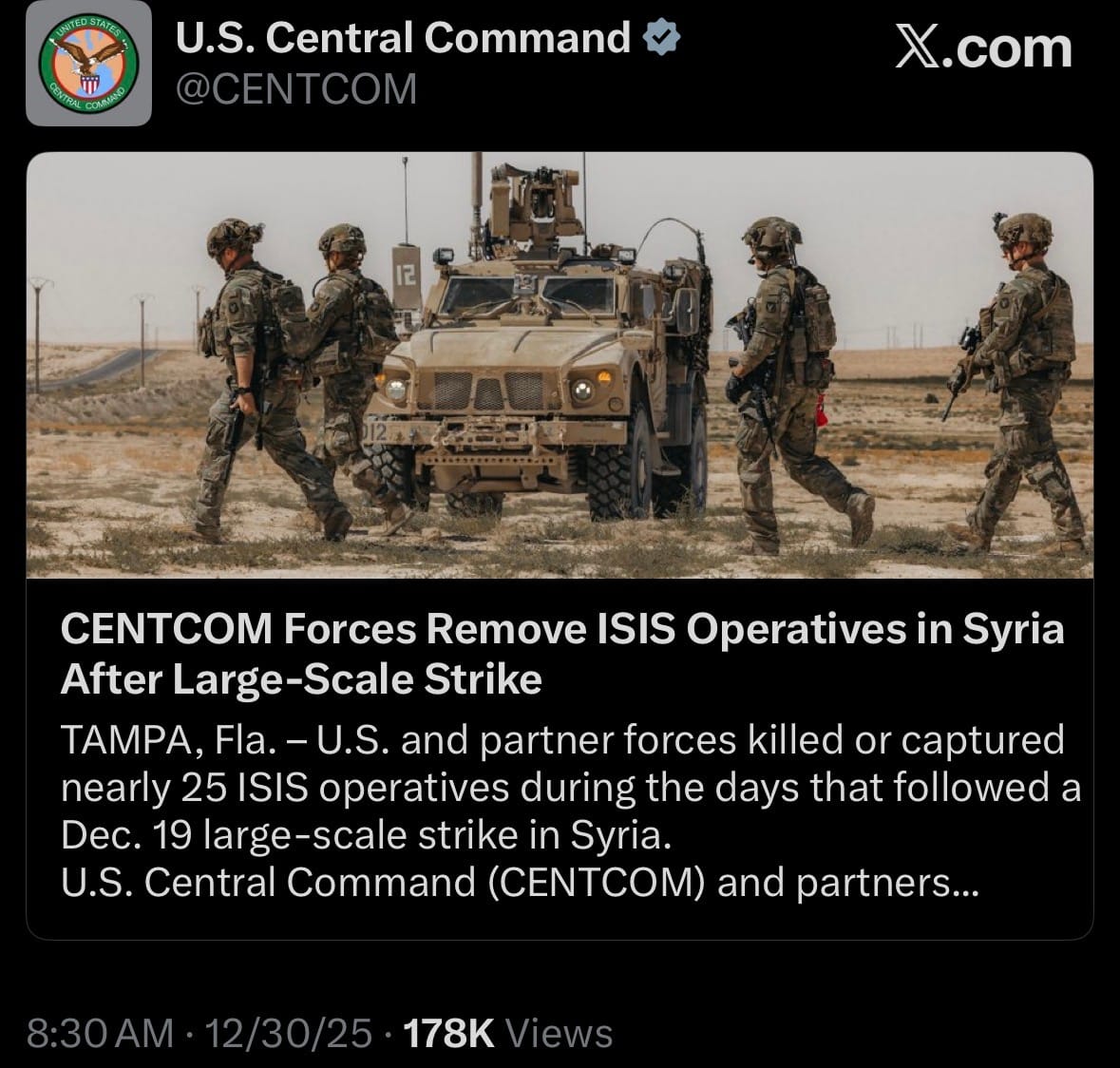- On December 30, 2025, U.S. Central Command (CENTCOM) announced that U.S. and partner forces conducted 11 ground missions in Syria from December 20-29, killing at least seven ISIS operatives, capturing nearly 18 others (totaling nearly 25 militants affected), and destroying four weapons caches. These raids followed the large-scale Operation Hawkeye Strike launched on December 19, where U.S. and Jordanian forces—using dozens of fighter aircraft, attack helicopters, and artillery—hit over 70 ISIS targets across central Syria with more than 100 precision munitions, degrading infrastructure and weapons sites.
