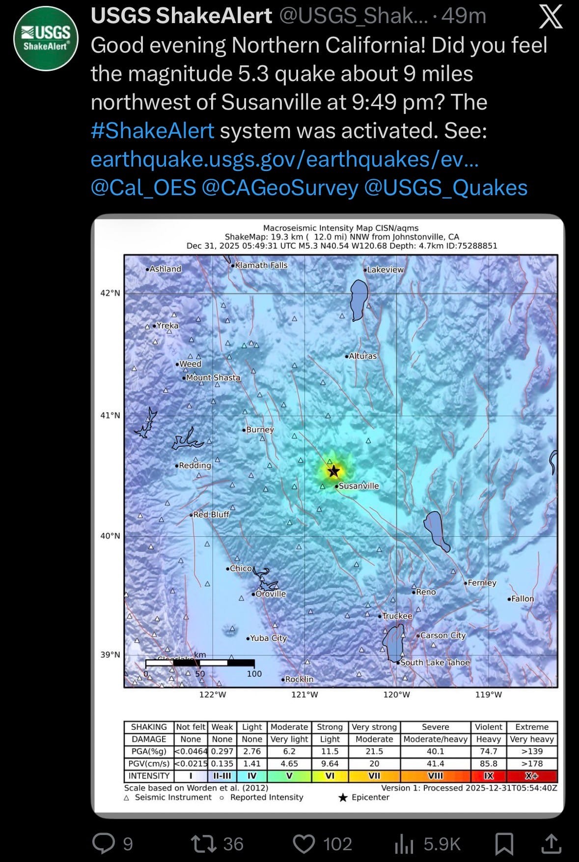 - On December 31, 2025 (late evening December 30 PST), a magnitude 5.3 earthquake struck approximately 9 miles (14 km) northwest of Susanville in Lassen County, Northern California, at 9:49 p.m. local time (05:49 UTC on December 31). The shallow quake (depth ~3-5 miles) triggered the ShakeAlert early warning system, sending alerts to mobile devices in affected areas seconds before strong shaking arrived.