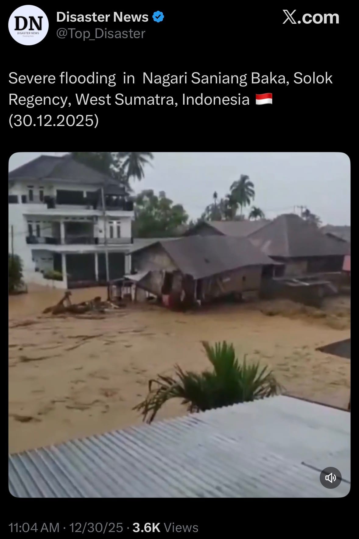 - On December 30, 2025, heavy rainfall triggered severe flooding and landslides in Nagari Saniang Baka, Solok Regency, West Sumatra, Indonesia. Floodwaters and debris flows inundated residential areas, damaged homes, swept away bridges, and disrupted roads, forcing evacuations of dozens of families to temporary shelters. Local authorities reported significant material losses, with no immediate fatalities but several residents injured or missing amid ongoing search efforts.