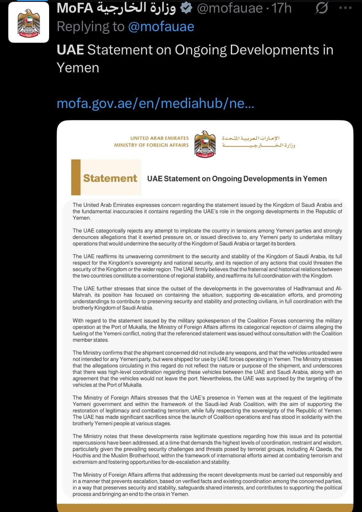 - On December 30, 2025, the United Arab Emirates announced the withdrawal of its remaining counterterrorism personnel from Yemen—the last UAE forces in the country since scaling back operations in 2019—amid rising tensions with Saudi Arabia. The move followed Saudi-led coalition airstrikes on vehicles and equipment at Mukalla port in Hadramaut province, which Saudi authorities described as neutralizing an unauthorized shipment intended for the UAE-supported Southern Transitional Council (STC) separatists. The UAE rejected the claim, asserting the vehicles belonged to its own forces and that the transfer had been coordinated with Saudi Arabia in advance; the strikes caused no casualties.