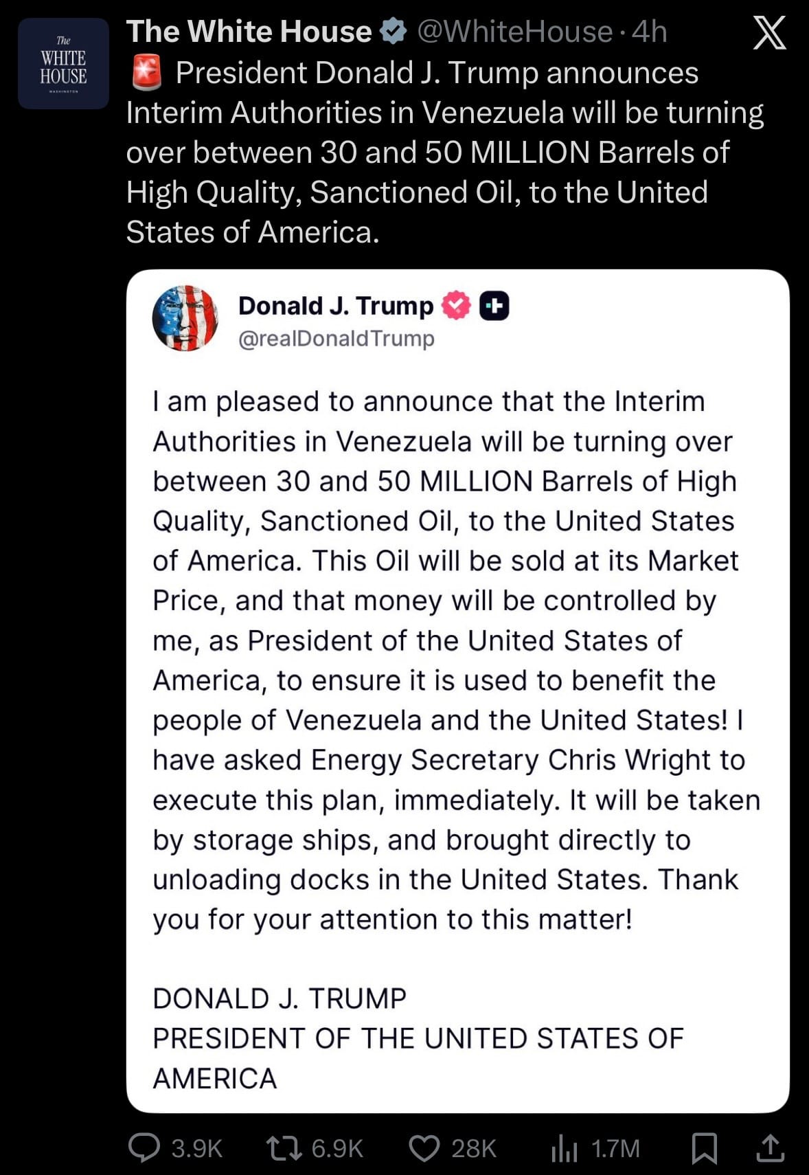- On January 6, 2026, U.S. President Donald Trump announced via Truth Social that Venezuelan interim authorities, following the U.S.-led capture of former President Nicolás Maduro in Operation Absolute Resolve, would transfer between 30 and 50 million barrels of sanctioned crude oil to the United States. The oil, described as high-quality Venezuelan heavy crude from state-owned PDVSA stockpiles, would be redirected to U.S. refineries under a deal facilitated by the interim government led by Vice President Delcy Rodríguez. Trump stated this would help offset U.S. energy costs amid global market volatility, framing it as part of broader efforts to dismantle "narco-terrorist" networks and recover assets tied to alleged illicit activities, with the transfer expected to begin within weeks via seized or rerouted tankers.