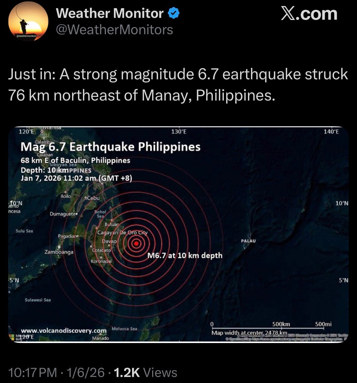 - On January 7, 2026, a magnitude 6.7 earthquake struck at 11:02 a.m. local time, with its epicenter located 76 km northeast of Manay in Davao Oriental province on Mindanao island, Philippines. The shallow quake (depth approximately 10-15 km) caused intense shaking—up to intensity VII on the PHIVOLCS scale—in nearby towns including Manay, Tarragona, and parts of Davao Oriental and Davao de Oro. Moderate shaking was felt across much of southeastern Mindanao, including Davao City, where high-rise buildings swayed and residents evacuated. No tsunami warning was issued, as the event did not meet threshold criteria.