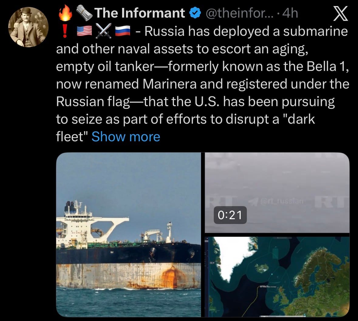 - On January 7, 2026, the aging oil tanker Marinera (formerly Bella 1) continued its voyage toward Murmansk, Russia, via the North Sea, positioned approximately 300 miles south of Iceland. Russia deployed a Kilo-class submarine and surface naval assets to escort the empty vessel after it changed name, painted a Russian flag on its hull, and re-registered under Russian flag in late December 2025. The move followed a failed U.S. Coast Guard boarding attempt in the Caribbean, where the crew repelled the operation. The tanker carries a U.S. judicial seizure warrant for allegedly transporting sanctioned Iranian oil linked to U.S.-designated terrorist groups.