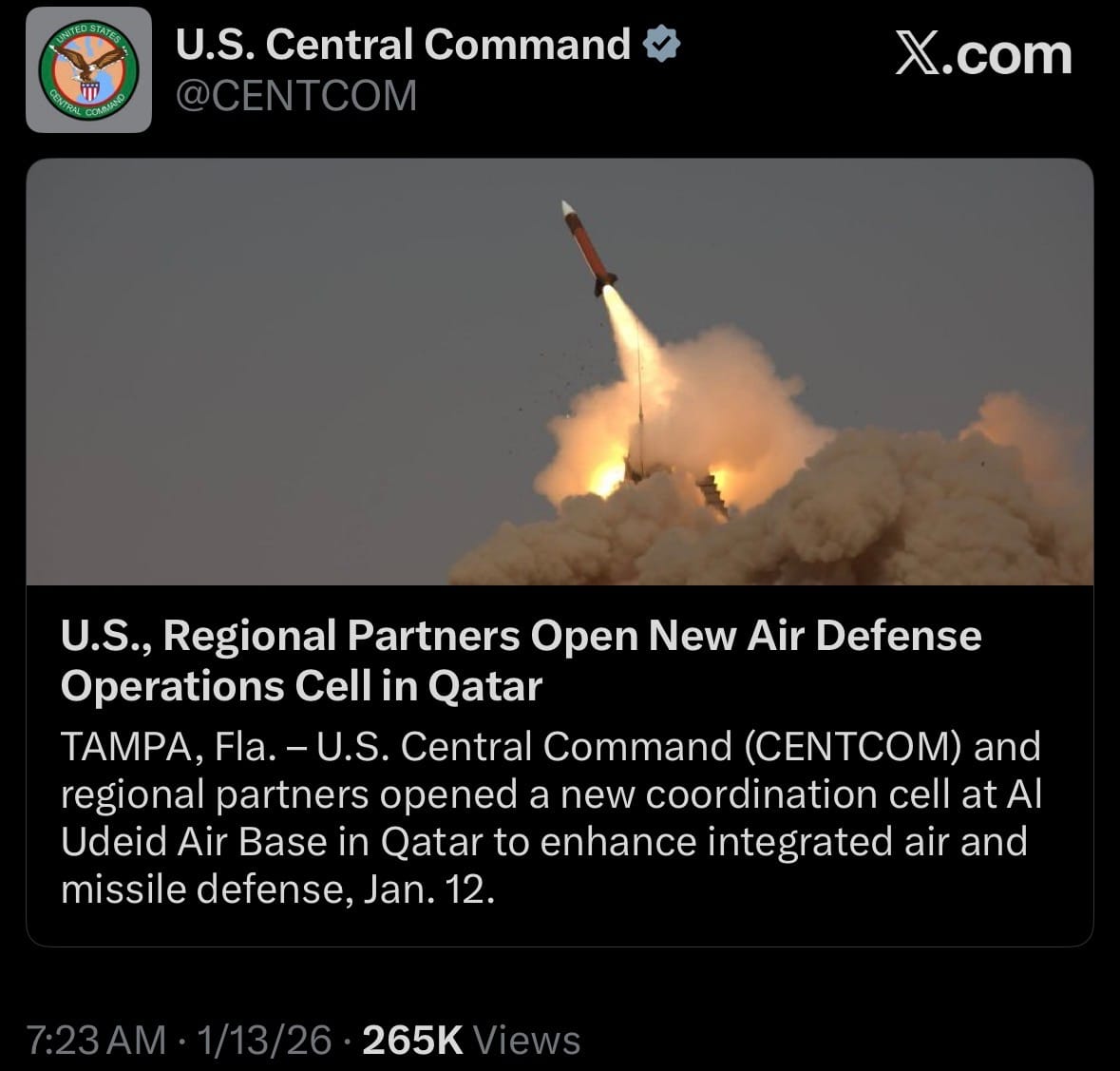 - On January 12, 2026, U.S. Central Command (CENTCOM) and regional partner nations established the Middle Eastern Air Defense – Combined Defense Operations Cell (MEAD-CDOC) at Al Udeid Air Base in Qatar. The new cell is integrated into the existing Combined Air Operations Center (CAOC), a multinational hub that has coordinated air operations across the Middle East for over 20 years and already includes representatives from 17 nations. MEAD-CDOC brings together U.S. and partner personnel to focus specifically on air and missile defense, enhancing real-time coordination, information sharing, and system integration without creating a separate facility.