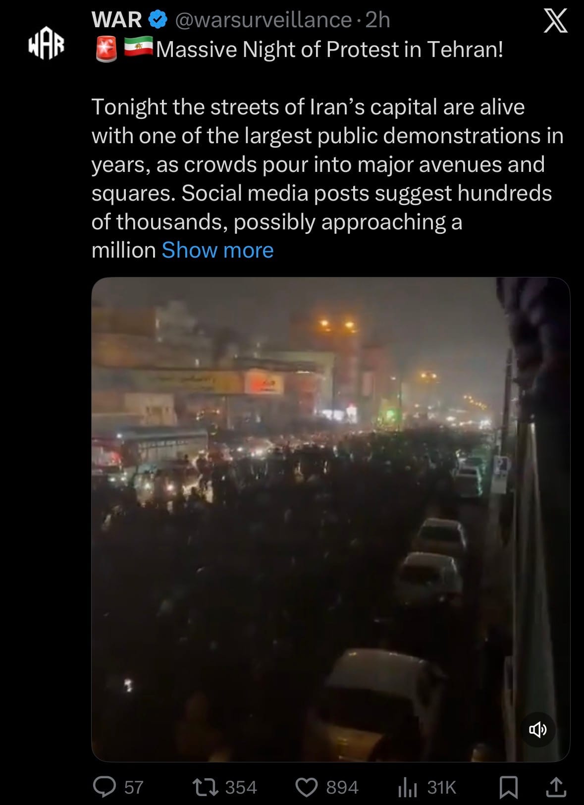 - As of January 13, 2026, Iranian anti-government protests continued with widespread demonstrations reported in Tehran and dozens of other cities across nearly all provinces. Social media footage and eyewitness accounts from activists show large crowds filling major avenues and squares in the capital tonight, with chants including "Death to the Dictator" (targeting Supreme Leader Ali Khamenei) and calls for regime change. Estimates of turnout vary widely due to the ongoing blackout—ranging from tens of thousands to claims of hundreds of thousands in Tehran alone—but images and videos depict significant gatherings despite severe repression. Protests remain fueled by economic grievances (rial collapse, inflation over 40%) and have evolved into explicit political demands, including support for exiled Crown Prince Reza Pahlavi in some areas.