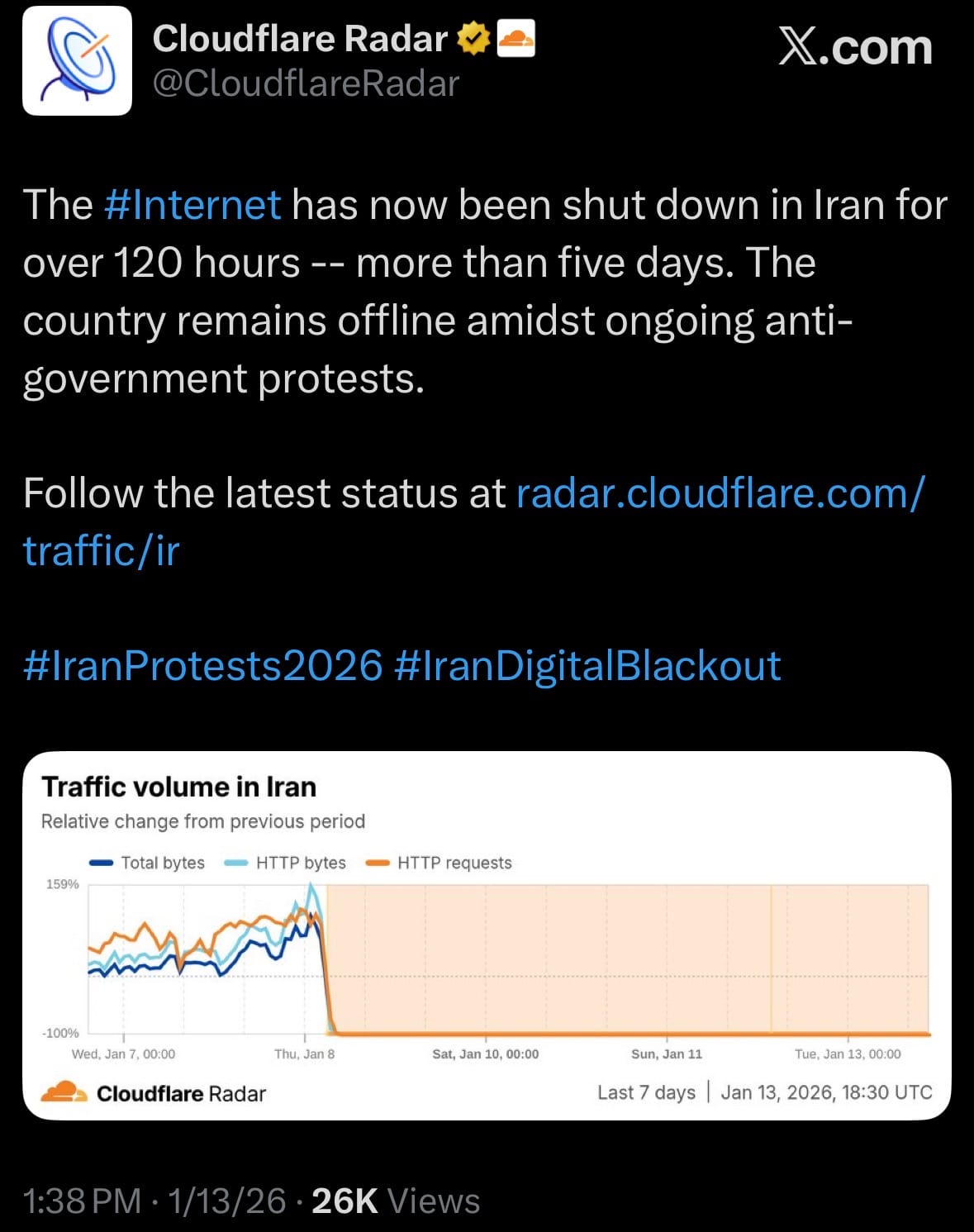 - Iranian authorities have maintained a near-total internet and communications blackout since January 8 (over 120 hours as of yesterday), severely restricting mobile data, social media, international calls, and domestic networks in Tehran and many provinces to disrupt coordination and limit documentation of events. Monitors like NetBlocks confirm the shutdown is among the most extensive on record, with selective jamming of satellite services (including Starlink) and door-to-door seizures of dishes reported. This has hindered real-time verification of crowd sizes and casualties, though rights groups continue estimating hundreds to thousands killed overall (disputed figures range from regime-reported low numbers to opposition claims exceeding 2,000 in recent days amid crackdowns). Security forces have used live fire, tear gas, and mass arrests, while pro-regime rallies were staged in Tehran to counter the narrative. The blackout and violence have intensified international concern, with calls for access restoration and restraint.