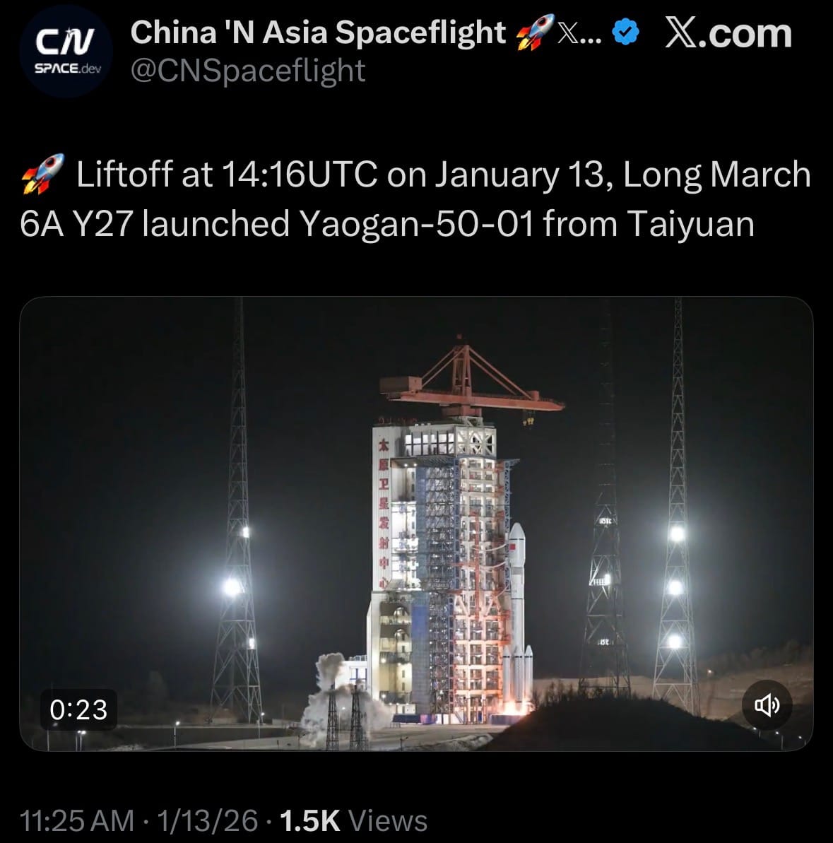 - On January 13, 2026, China successfully launched the Yaogan-50 01 remote sensing satellite aboard a modified Long March-6 rocket from the Taiyuan Satellite Launch Center in Shanxi Province. The rocket lifted off and placed the satellite into its planned orbit, marking China's first successful orbital launch of 2026 and the 624th flight of the Long March series. State media confirmed the mission proceeded without anomalies.