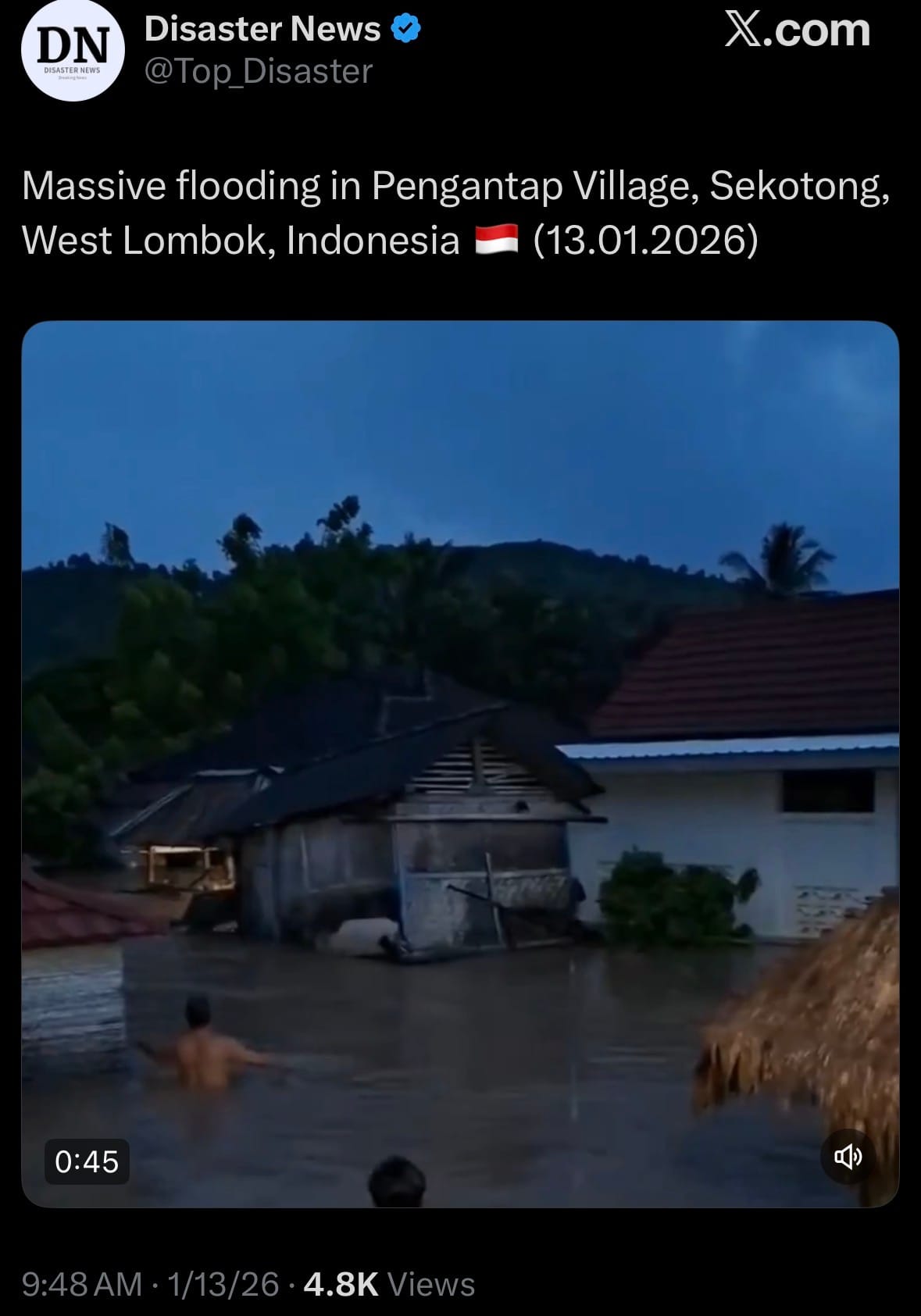 - On January 13, 2026, heavy rainfall triggered flash flooding in Pengantap Village (Desa Persiapan Pengantap), Sekotong District, West Lombok Regency, West Nusa Tenggara Province, Indonesia. Water levels reached chest height in some areas, sweeping away household items, furniture, and parts of homes (one house in Bengkang was reportedly carried away by the current), while roads and access were disrupted.
