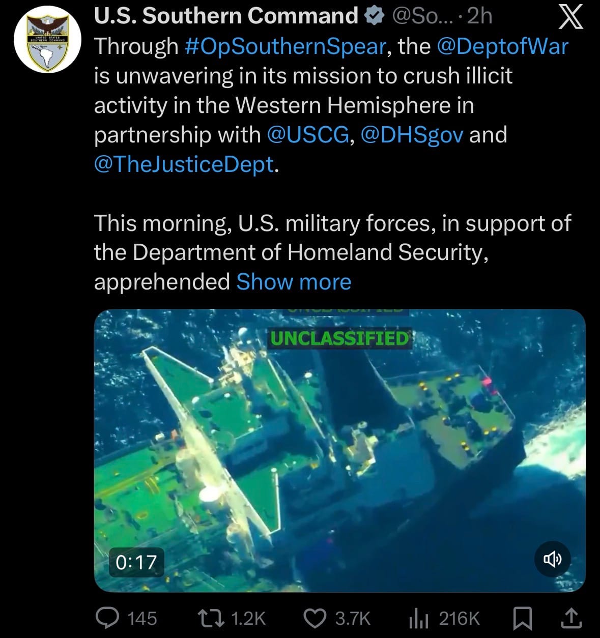 - The operation occurred without resistance or incident and involved coordinated efforts by the U.S. Coast Guard, Navy, Marine Corps, Department of Homeland Security, and Department of Justice. The vessel, flagged in Liberia or Panama (reports vary) and managed by Hong Kong-based entities tied to shadow fleet operations that obscure origins of oil from Venezuela, Iran, Russia, and other sanctioned sources, was detained to ensure only authorized and lawful Venezuelan oil exports proceed. U.S. Southern Command released aerial video footage of the tanker, and the action aligns with ongoing enforcement under Operation Southern Spear (launched late 2025) targeting illicit oil shipments and related activities in the Western Hemisphere, with monitoring and potential further interdictions continuing.