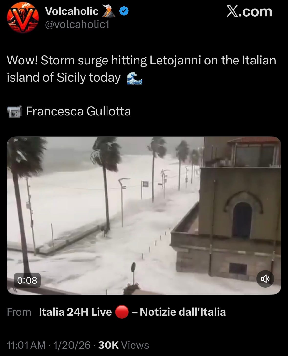 - On January 20, 2026, a strong storm surge affected Letojanni, a coastal town in Messina province on Sicily’s eastern Ionian coast, during an intense Mediterranean low-pressure system named Harry. Large waves, fueled by strong winds and rough seas, overtopped the seafront promenade (lungomare), flooding the coastal road, scattering debris, and causing damage that included the partial collapse of a section of the walkway and a wall in the adjacent Mazzeo area, between Letojanni and Taormina.