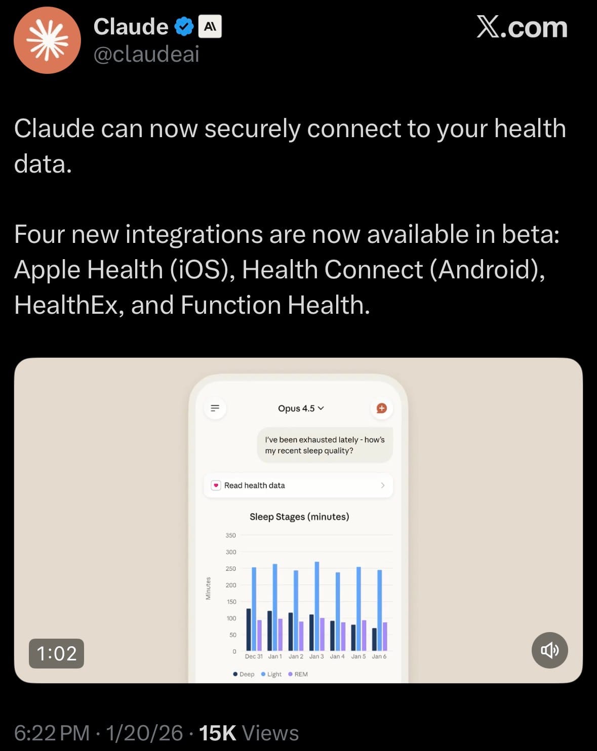 - On January 20, 2026, Anthropic announced that Claude can now securely connect to users' personal health data through four new beta integrations: Apple Health (via the iOS app), Health Connect (via the Android app), HealthEx, and Function Health. The feature is available to Claude Pro and Max subscribers in the United States and requires explicit opt-in permission, allowing Claude to access only the data users choose to share.