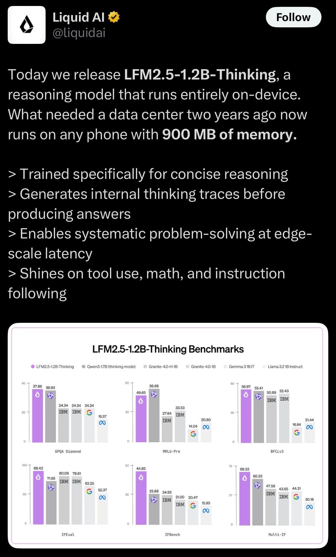- On January 20, 2026, Liquid AI released LFM2.5-1.2B-Thinking, a 1.2 billion parameter AI model that runs fully offline on phones, laptops, or other devices using only ~900 MB of memory. It uses a fast, efficient design to process up to 239 tokens per second on AMD chips and ~82 on Snapdragon phone chips. Trained on 28 trillion tokens with reinforcement learning, it “thinks” in short internal steps before answering, excelling at math, tool use, and following instructions (e.g., math benchmark scores rose from 63 to 88). It outperforms some larger models like Qwen3-1.7B on key tests while using less power. The model is free to download (open-source/open-weight) from Hugging Face under a permissive license, with easy-to-use versions for tools like llama.cpp, MLX, and ONNX, plus support from Qualcomm and AMD.