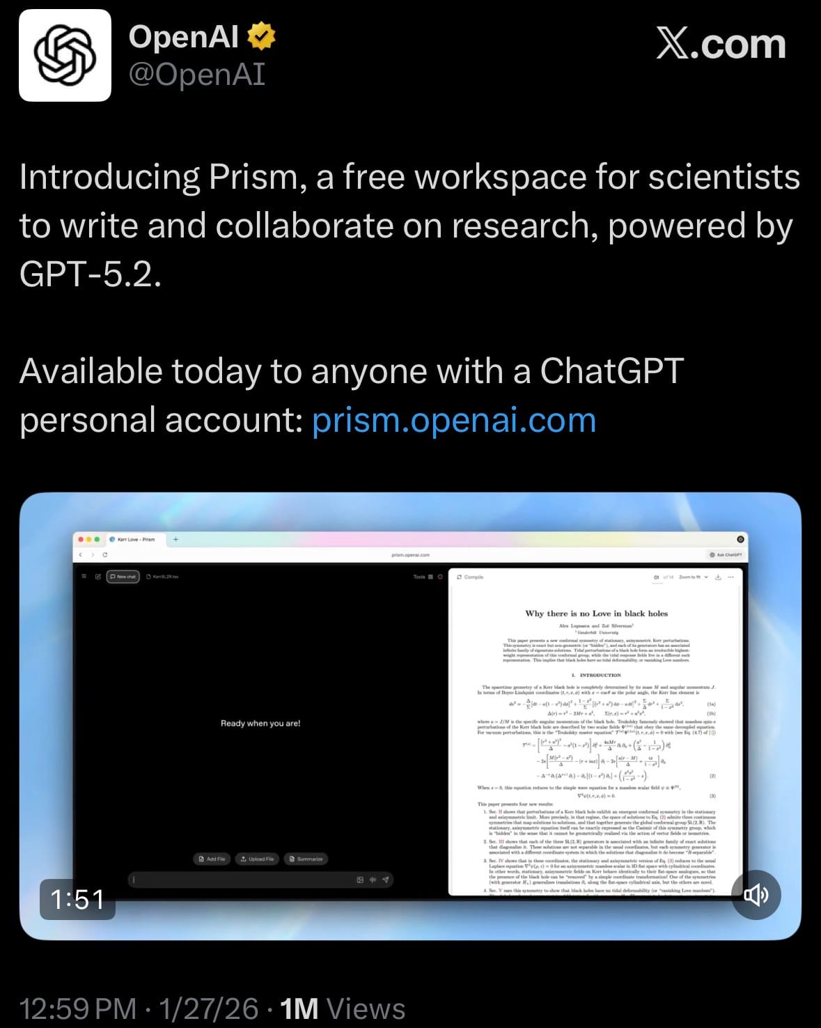 - On January 27, 2026, OpenAI launched Prism, a free dedicated workspace designed specifically for scientists to write, collaborate on, and manage research projects, powered by GPT-5.2. The platform is available immediately to anyone with a standard ChatGPT personal account at prism.openai.com.