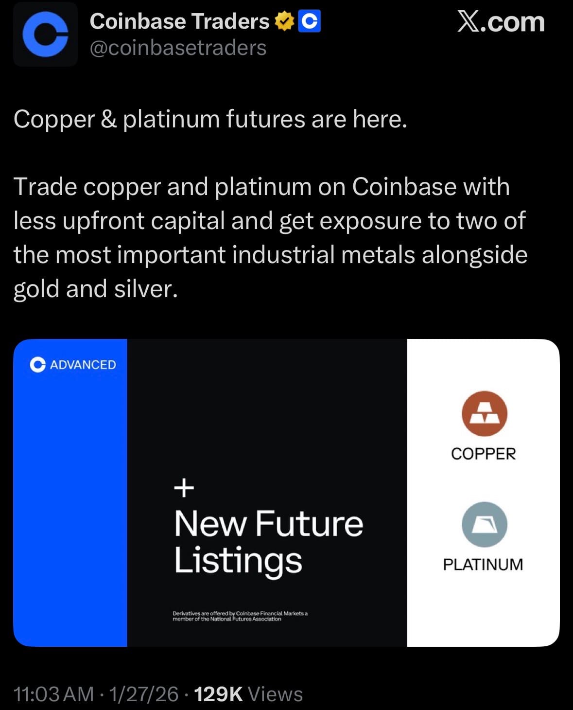 - On January 27, 2026, Coinbase announced the launch of copper and platinum futures trading on its platform. Users can now trade these contracts with lower upfront capital requirements compared to traditional exchanges, gaining leveraged exposure to two key industrial metals.