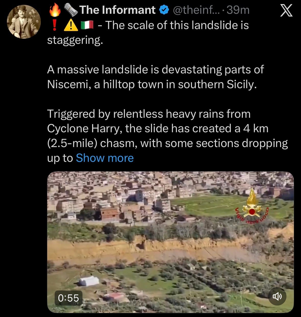 - On January 27, 2026, a massive landslide triggered by heavy rains from Cyclone Harry devastated parts of Niscemi, a hilltop town in southern Sicily. The slide carved out a 4 km (2.5-mile) chasm, with drops of 20–50 meters in places, leaving entire neighborhoods, homes, streets, and vehicles precariously perched on the edge of a sheer cliff. The hillside remains active and continues shifting toward the Gela plain below.