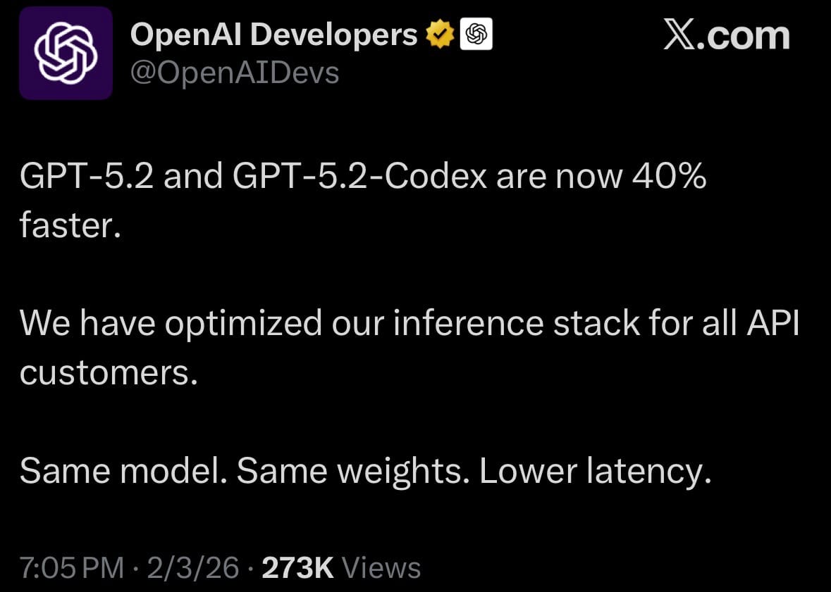 - On February 3, 2026, OpenAI announced that GPT-5.2 and GPT-5.2-Codex are now 40% faster due to optimizations in their inference stack. The update applies to all API customers and requires no changes from users. The models themselves (same weights and capabilities) deliver significantly lower latency across the board, improving response times for chat completions, function calling, agent workflows, tool use, and code generation tasks.
