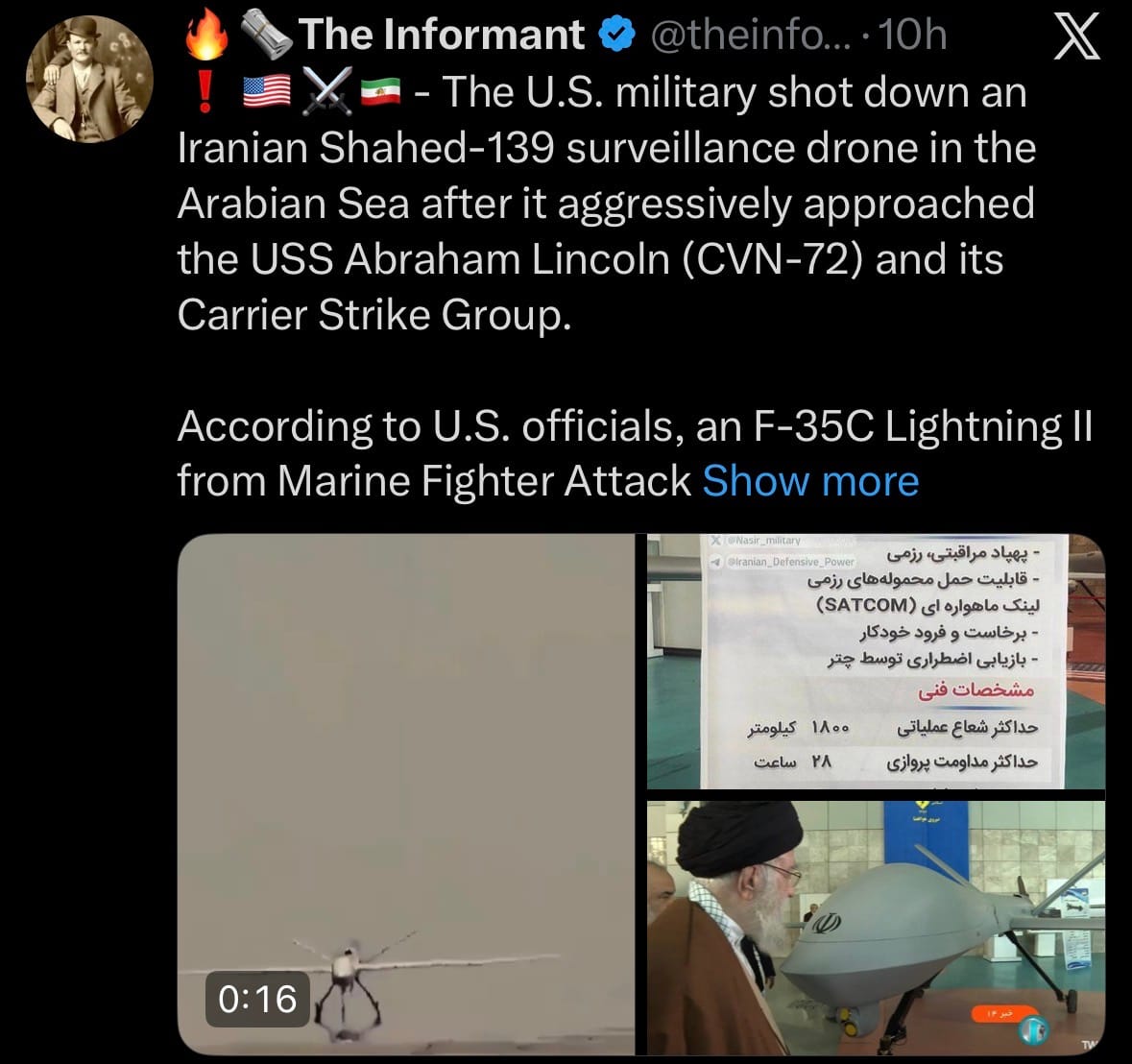 - On February 3, 2026, the U.S. military shot down an Iranian Shahed-139 surveillance drone in the Arabian Sea after it aggressively approached the USS Abraham Lincoln (CVN-72) Carrier Strike Group. According to U.S. officials, an F-35C Lightning II from Marine Fighter Attack Squadron 314 (VMFA-314), embarked on the carrier, engaged and destroyed the drone.