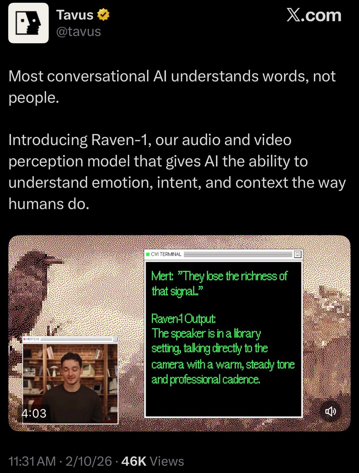 - On February 10, 2026, Tavus launched Raven-1, a new AI model built to make conversational AI understand people more like humans do—by paying attention to both words and how someone actually looks and sounds. Unlike most AI that mainly reads text or just hears spoken words, Raven-1 watches video and listens to audio at the same time in real time. It picks up on tone of voice, speed of talking, laughs, pauses, facial expressions, gestures, body language, and even the surroundings.