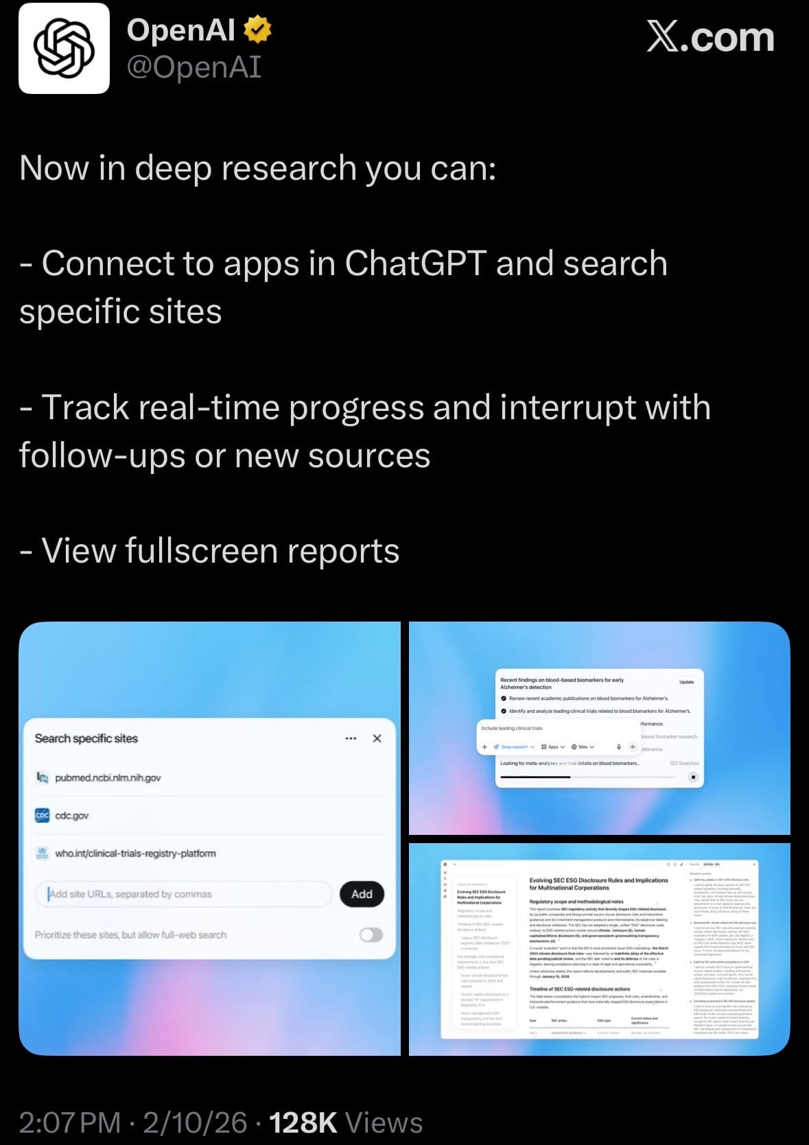 - February 10, 2026 – OpenAI has released an update to the Deep Research feature in ChatGPT, introducing several enhancements aimed at improving accuracy, control, and usability for in-depth queries. The update enables users to connect Deep Research to external apps (including those via MCP) and restrict searches to specific trusted websites or sources.