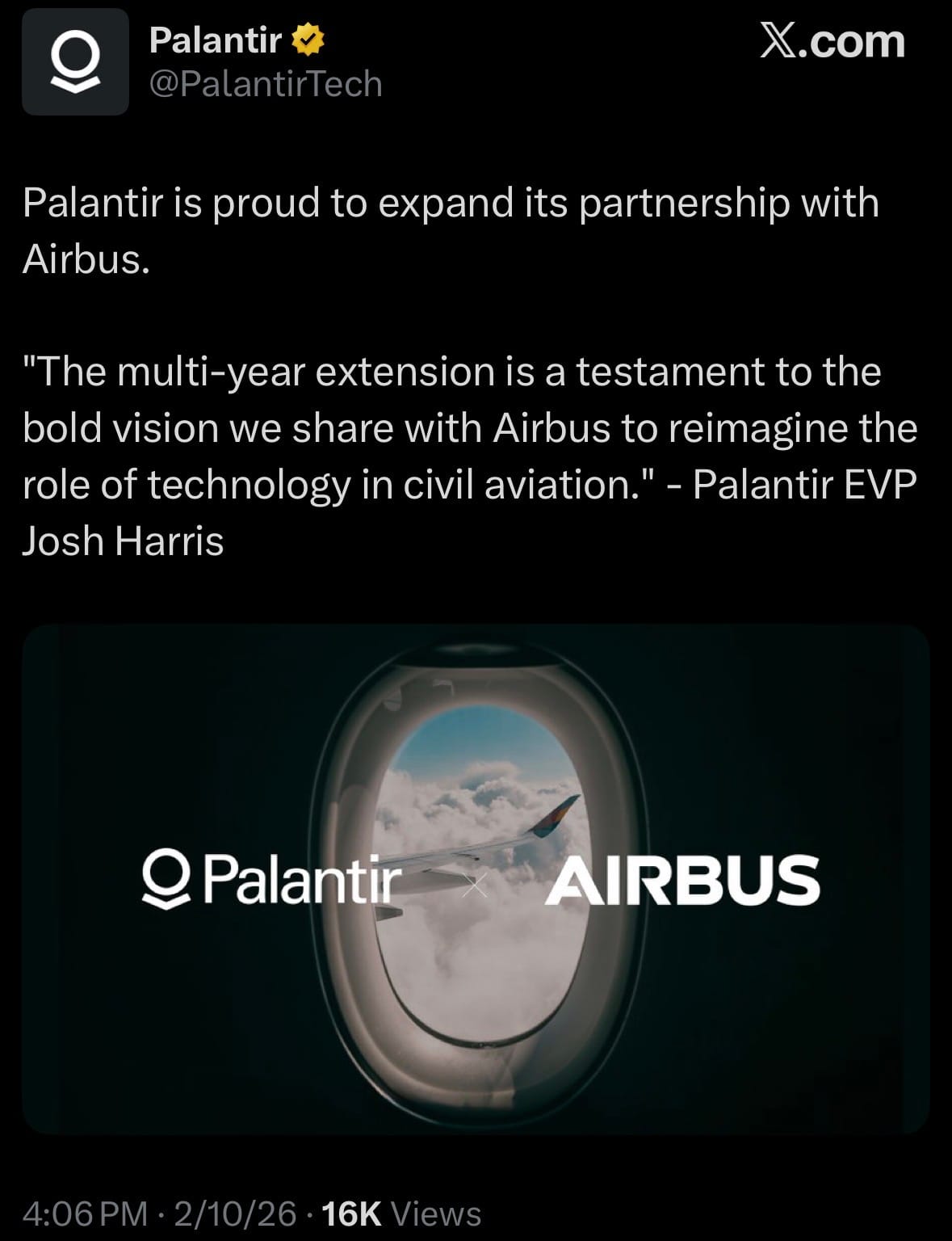 - February 10, 2026 – Palantir Technologies announced a multi-year extension of its strategic partnership with Airbus, originally established in 2015. The collaboration focuses on Palantir’s ongoing role in supporting Skywise, Airbus’s open data platform for the civil aviation industry. Skywise supports data-driven decision-making in planning, supply chain management, airline operations, aircraft production, and aircraft maintenance, and is currently used by over 50,000 daily active users.
