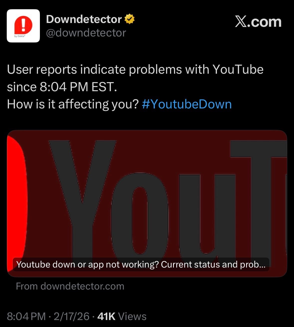- On February 17, 2026, YouTube experienced a widespread outage beginning around 7:45 p.m. EST (4:45 p.m. PT), with user reports surging sharply by approximately 8 p.m. EST. Outage tracking site Downdetector recorded over 300,000 complaints in the U.S., peaking higher in some updates, primarily related to the app (about 56% of reports), website loading issues (around 20%), and login problems. Many users encountered a "something went wrong" error, with difficulties accessing the homepage, subscriptions feed, and video playback, though some individual videos remained viewable in limited cases. The disruption also affected YouTube TV to a lesser extent.