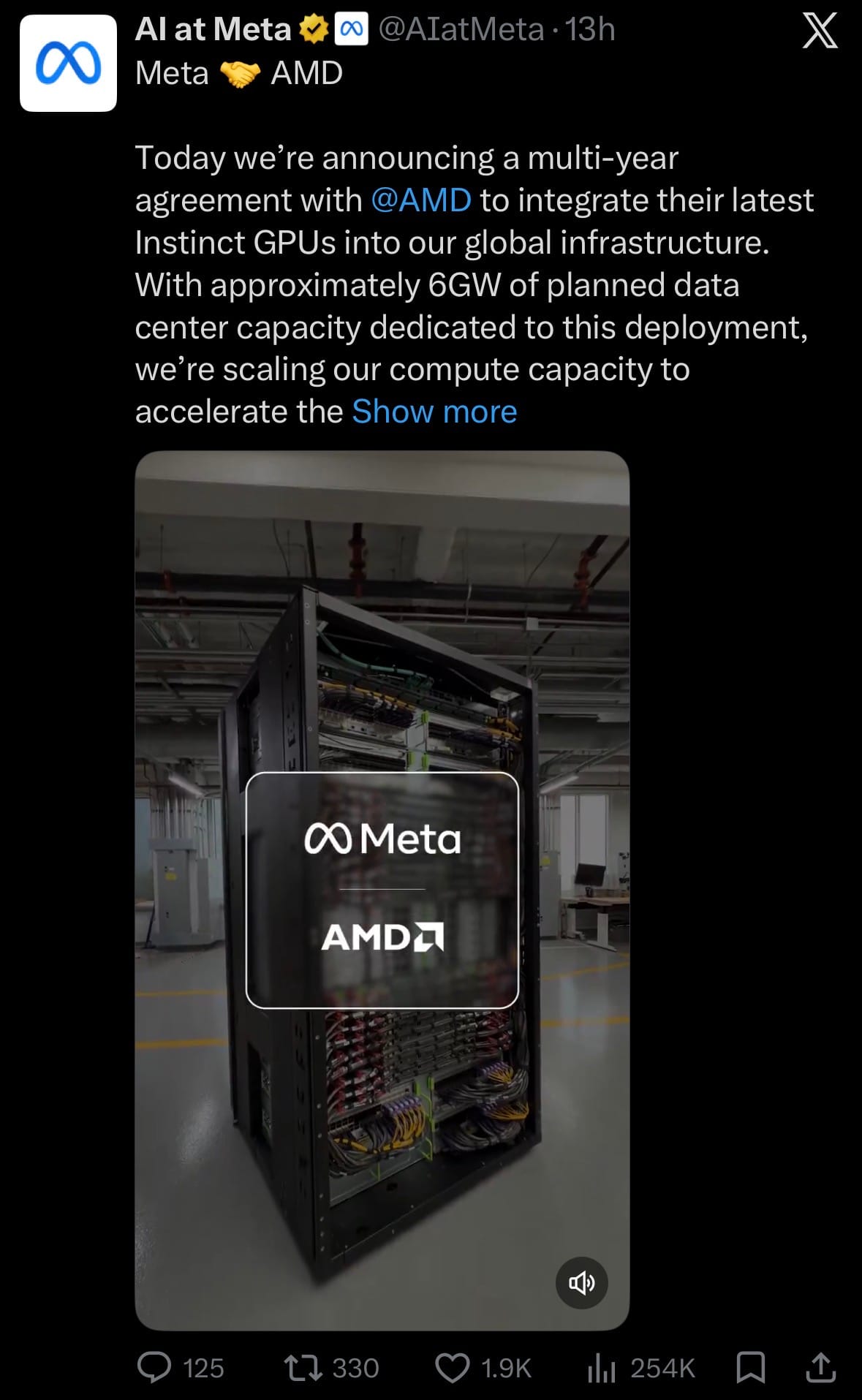 - On February 24, 2026, Meta announced a long-term partnership with AMD to install up to 6 gigawatts (GW) of AMD's powerful Instinct GPUs in its worldwide data centers to power AI work. The first phase (1 GW) will use special custom Instinct GPUs from the MI450 family, combined with AMD's next-generation EPYC CPUs (codenamed Venice) and a new rack design called Helios, with the first shipments starting in the second half of 2026.