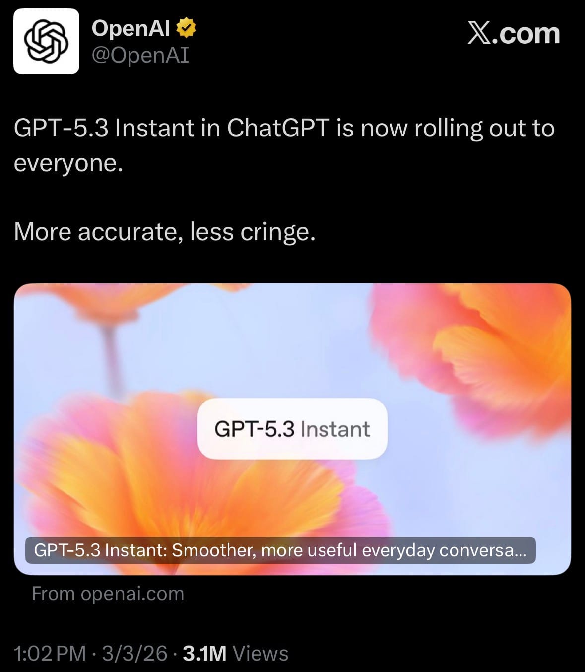 - OpenAI described the changes as making responses "more accurate, less cringe," addressing widespread user feedback about GPT-5.2 Instant feeling patronizing or overly dramatic. The model is also available to developers via the API as "gpt-5.3-chat-latest," with GPT-5.2 Instant remaining accessible for paid users in the legacy section until retirement on June 3, 2026. Updates to Thinking and Pro variants are expected soon.