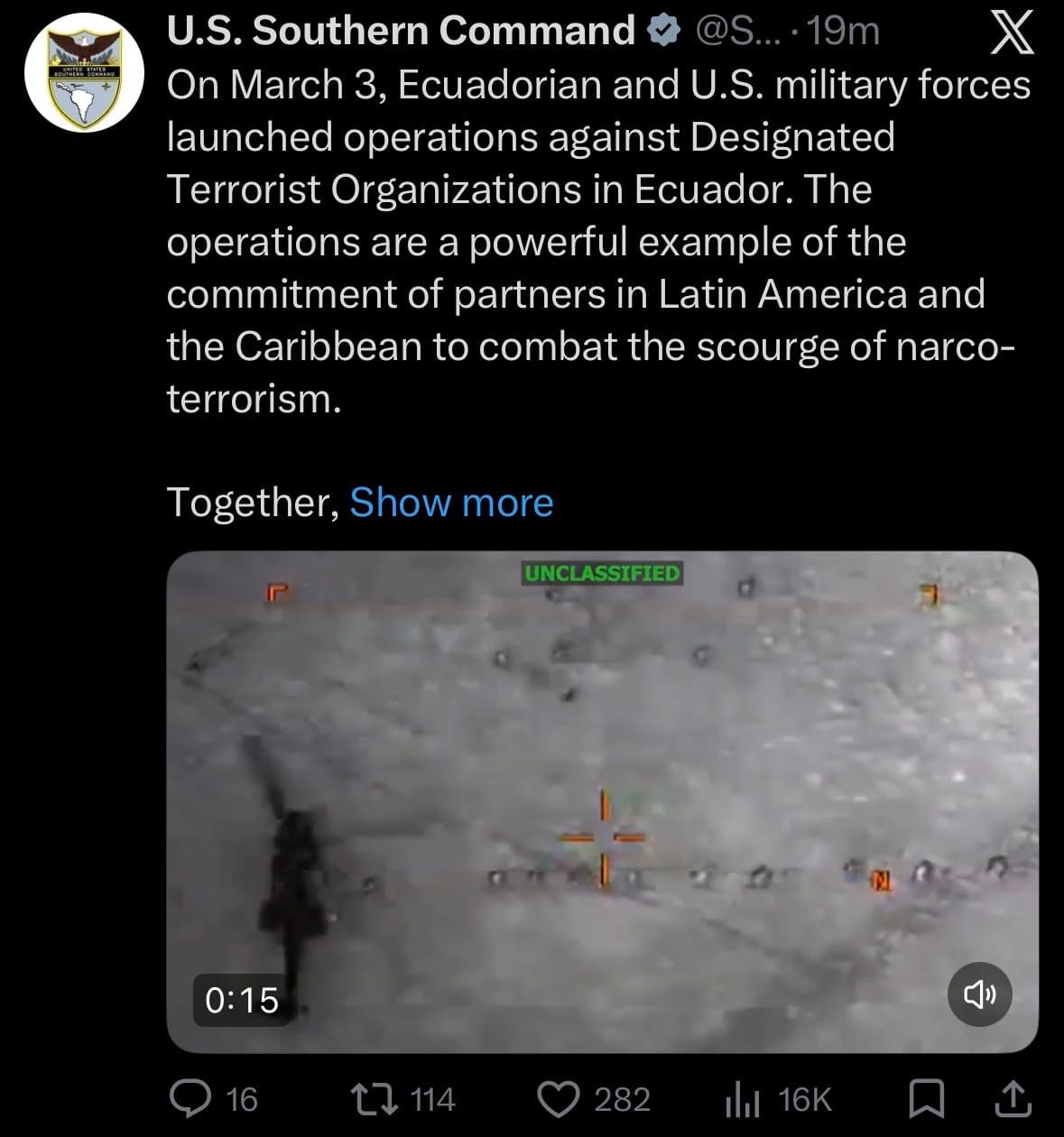 - On March 3, 2026, joint Ecuadorian and U.S. military forces launched coordinated operations targeting designated terrorist organizations in Ecuador, focusing on narco-terrorist groups tied to drug trafficking, violence, and corruption in the region. The operations, overseen by U.S. Southern Command (SOUTHCOM), included raids, intelligence sharing, and direct action against cartel-linked networks operating inside Ecuadorian territory.