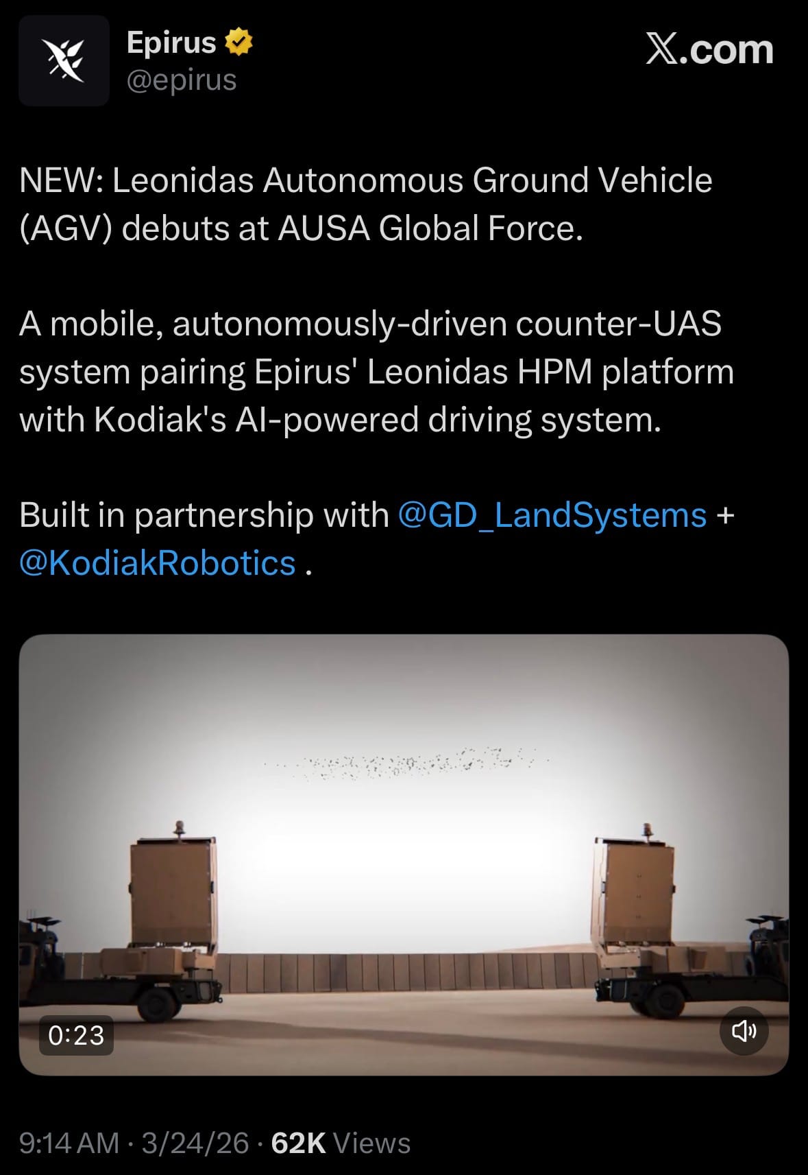 - On March 23, 2026, Epirus, Kodiak Robotics, and General Dynamics Land Systems unveiled the Leonidas Autonomous Ground Vehicle (AGV) at the AUSA Global Force Symposium.