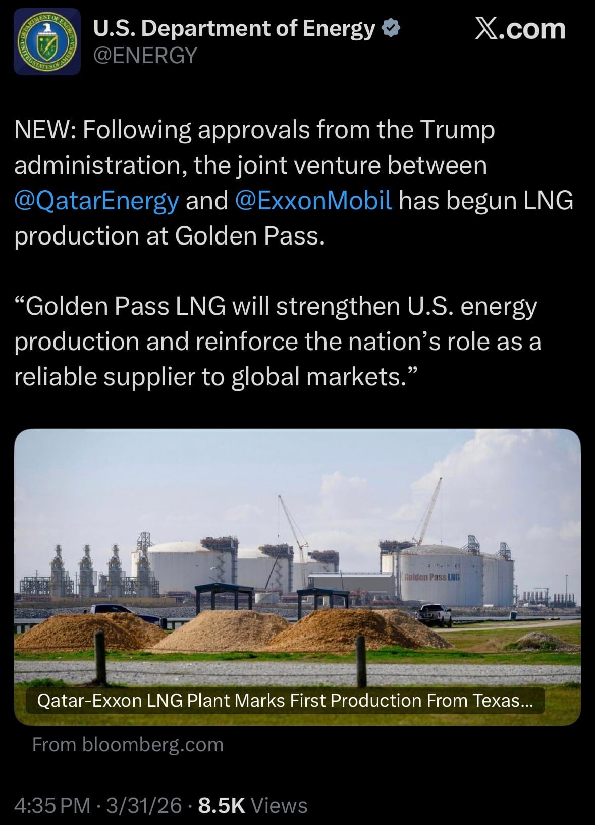 - On March 31, 2026, the joint venture between QatarEnergy and ExxonMobil officially started LNG production at the Golden Pass LNG terminal in Texas, following final approvals from the Trump administration.