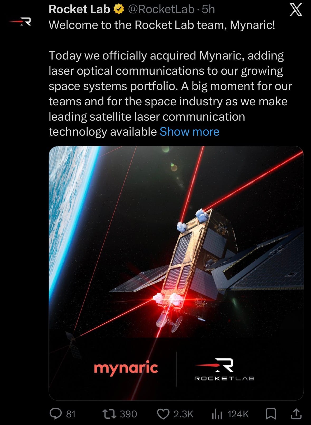 - On April 14, 2026, Rocket Lab officially completed its acquisition of Mynaric, a German leader in laser optical communications terminals, for $155.3 million (cash plus shares).