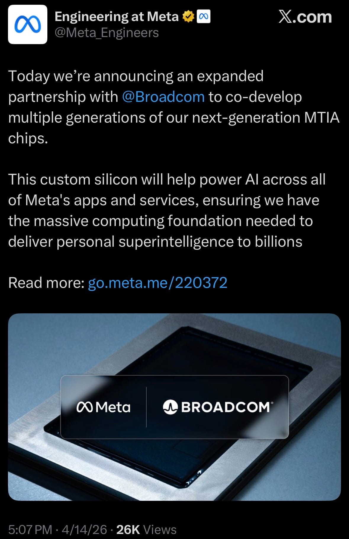 - On April 14, 2026, Meta announced an expanded multi-year partnership with Broadcom to co-develop multiple generations of its next-generation MTIA (Meta Training and Inference Accelerator) chips, extending the collaboration through 2029 and including the industry’s first 2nm AI compute accelerator.