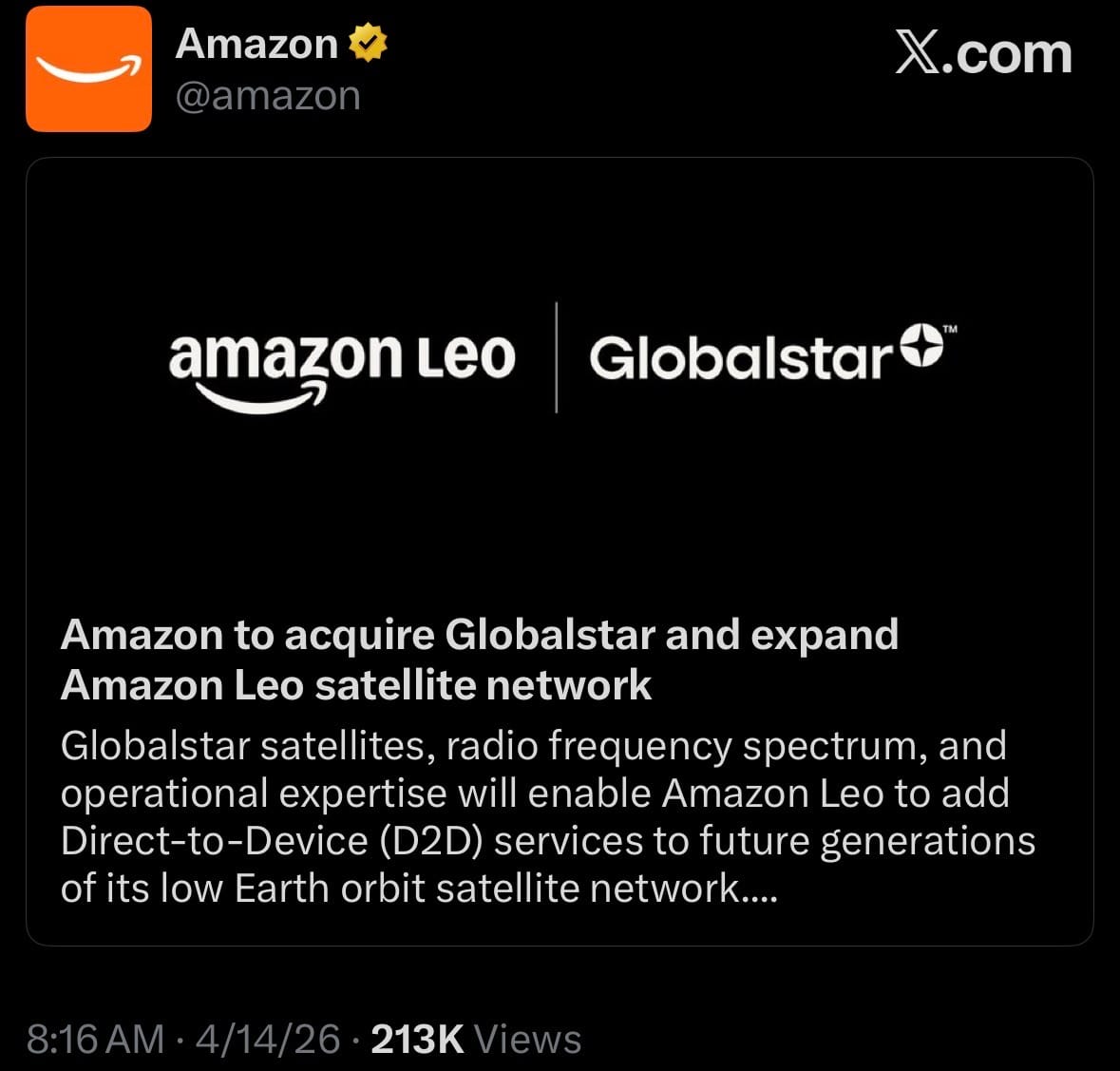 - The deal includes Globalstar’s existing satellite constellation, ground infrastructure, and valuable spectrum licenses, enabling direct-to-device (D2D) connectivity so standard smartphones can connect directly to satellites for voice, text, and data in remote areas without cell coverage, while strengthening Amazon’s competition with SpaceX’s Starlink. The acquisition is expected to close in 2027.
